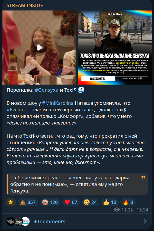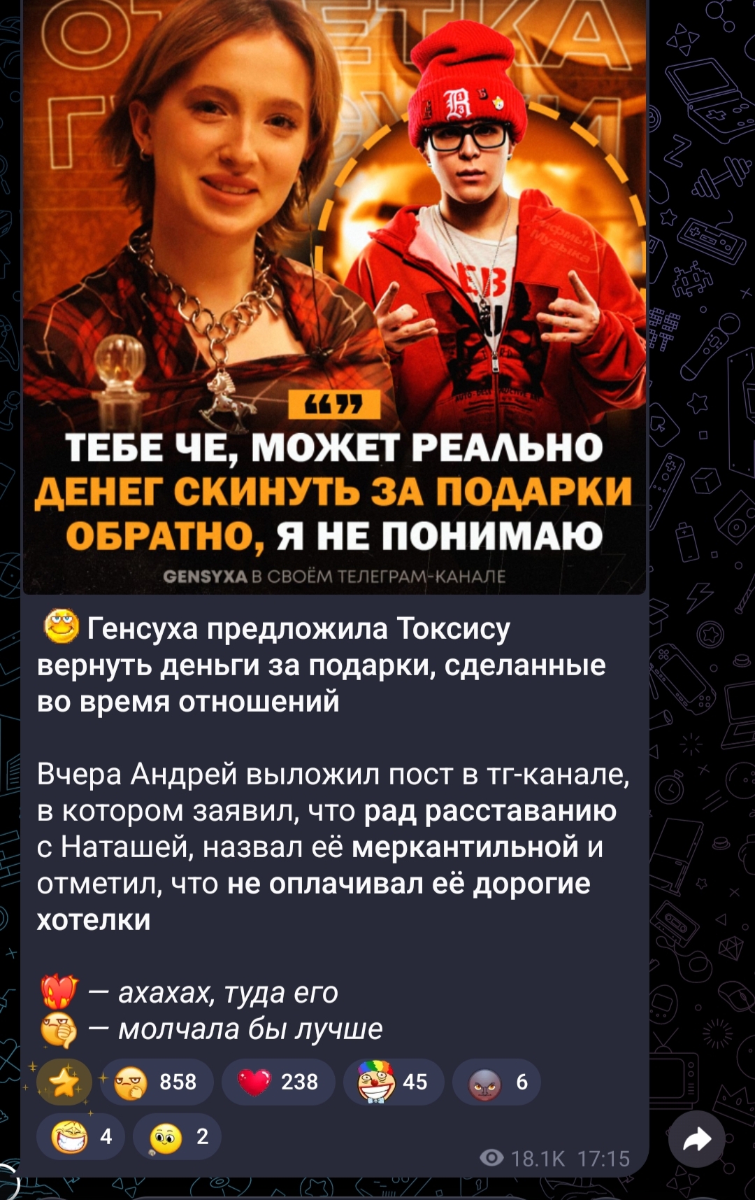 Токсис красавчик. Попустил меркантильную хайпожорку, что общается с вадосом только пади хайпа в тт. Надеюсь он еще трек дропнет и расскажет в подробностях как ебал лысуху в толчке, что бы с ней даже рядом находится было закшкварно