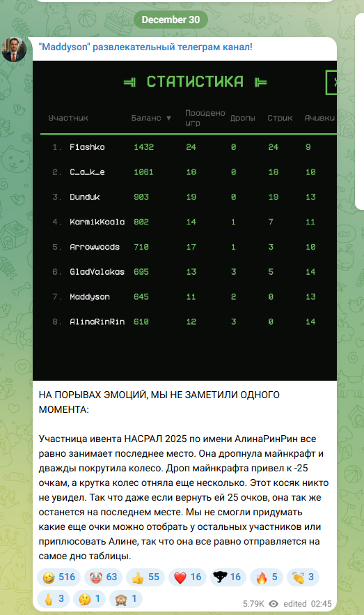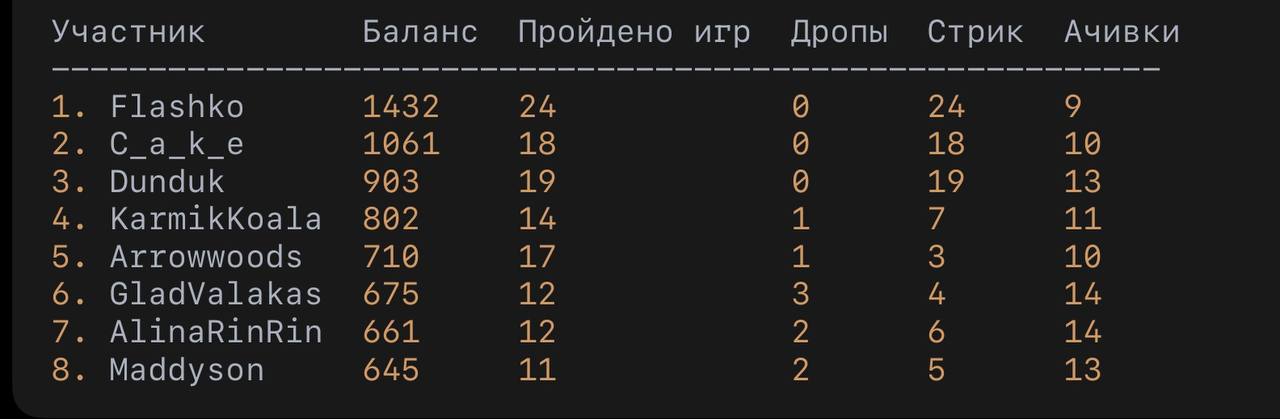 Раз Чмодье попался на том что использовал читы в Ивенте, то значит он и другие игры проходил тоже с читами. А если бы он играл без читов то прошел бы меньше игр и получил бы меньше рейтинга чем Алина Рин. Тогда на последнем месте должен быть он.