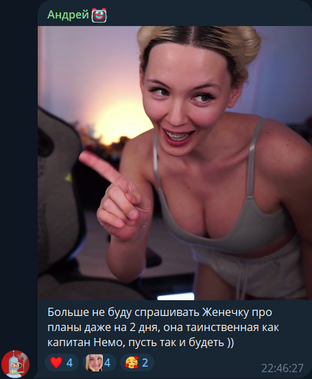Где-то осенью 23-го, когда речь зашла про тренировку голоса, говорила что с ней в дискорде связалась т-тянка с женским голосом и женским паспортом. Как выяснилось, она вышла замуж за нормального челика. Несколько месяцев встречались и челик не догадывался о подвохе, пока дело не дошло до постели, где "тётя" созналась. Челик в шоке убежал и не выходил на связь какое-то время, но потом вернулся - любовь-морковь, все дела. Видимо, вот такая линия развития отношений идеальна для тёти Жени. Состоятельный и накаченный гетеросексуальный чед, не слыхавший про Гилтикус, подкатывает к ней как тянке и понеслась. Он, конечно, в процессе охреневает, но любовь побеждает. Как это должно быть реализовано на практике с ленивой Женечкой, большой вопрос.