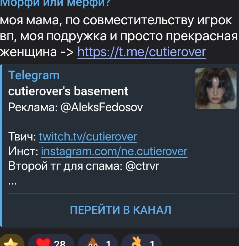 Так Катьку он тоже ебал, боевые подруги получается, мало того Морфи у Катьки в модераторах, ахуеешь? А у опасного Алёши в подписках до сих пор есть Катька, вчерашний стрим пруф, лень искать момент и делать скрин