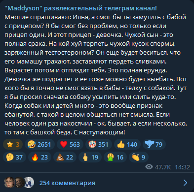 Многие спрашивают: Илья, а смог бы ты замутить с бабой с прицепом? Я бы смог без проблем, но только если прицеп один. И этот прицеп - девочка. Чужой сын - это полная срака. На кой хуй терпеть чужой кусок спермы, заряженный тестостероном? Он еще будет беситься, что его мамашу трахают, заставляют пердеть сливками. Вырастет потом и отпиздит тебя. Это полная ерунда. Девочка же подрастет и её тоже можно будет выебать. Вот кого бы я точно не смог взять в бабы - телку с собакой. Тут я бы просил сначала собаку усыпить или слить куда-то. Когда собак или детей много - это вообще признак ебанутой, с такой в целом общаться нет смысла. Если человек один раз накосячил - ок, бывает, а если несколько, то там с башкой беда. С наступающим!