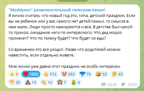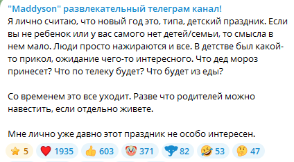 Я лично считаю, что новый год это, типа, детский праздник. Если вы не ребенок или у вас самого нет детей/семьи, то смысла в нем мало. Люди просто нажираются и все. В детстве был какой-то прикол, ожидание чего-то интересного. Что дед мороз принесет? Что по телеку будет? Что будет из еды?