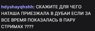 Бля ну Наташа всегда была такой. Она ищет выгоду от действий. Она видит что стримы тухлые и просто чилит в Дубае. Если бы приехали Монке я уверен она бы с этой виллы бы не выходила, а так она понимает что профита ноль, просто трата времени. Вспомните как она в первый день рвалась стримить, че то пыталась насуетить, теперь поняла что там все в тильте с рождения и спокойно с Маман по ТЦ гуляет. Приедет максимум к Авалону на стрим, пару раз сделает сисюлики, пообнимается на тиктоки и все.