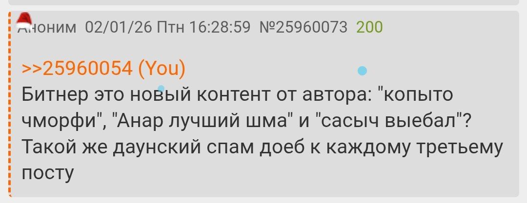 Я немного подлил биттнера в ЛОХ тред и че то ахуел. Я знал, что там сидят особенные люди, не такие как на остальном дваче. Хотя бы просто уже из-за сабжа треда. Но бля, они даже общаются как вконтактобыдло или в тиктоках школьники. Ответки у них прям подростковые такие нормисные, обычно тянки зубастые такое пишут в срачах.
