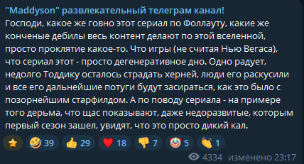 Господи, какое же говно этот сериал по Фоллауту, какие же конченые дебилы весь контент делают по этой вселенной, просто проклятие какое-то. Что игры (не считая Нью Вегаса), что сериал этот - просто дегенеративное дно. Одно радует, недолго Тоддику осталось страдать херней, люди его раскусили и все его дальнейшие потуги будут засираться, как это было с позорнейшим старфилдом. А по поводу сериала - на примере того дерьма, что щас показывают, даже недоразвитые, которым первый сезон зашел, увидят какой это дикий кал.