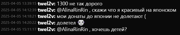 >>25966185 Ты даун иль чо? У неё 600 фолловеров и средний онлайн 30 зрилов, из которых в чат пишет скорее всего не больше 10. Кем нужно быть чтоб она не заметила сообщение, о какой борьбе за внимание ты говоришь? С кем ты это сравниваешь? С ненормой у которой 1000 онлайна на последних стримах и чат летит так что сидя за компом иногда не успеваешь прочитать некоторые сообщения, а ей это надо с телефона сделать.
