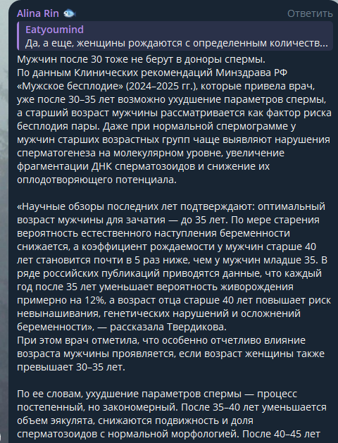 Пуззло у себя в чате тележки появилось? Угадайте что ее стриггерило? Чел написал про уменьшение количества яйцеклето с вощрастом, пуззло не удержалось и запостило полотно про ухвдшение качества спермы с возрастом. А ВОТ У МУЖЧИН