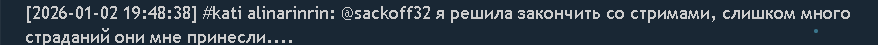[2026-01-02 18:38:10] #kati alinarinrin: круто, Винтем [2026-01-02 18:38:20] #kati alinarinrin: Это ты сделал? [2026-01-02 18:38:29] #kati alinarinrin: @santimeter харёёё [2026-01-02 18:39:56] #kati alinarinrin: @Vintem_ поню реально и в хвост и в гриву на насрале [2026-01-02 18:39:57] #kati alinarinrin: бедная [2026-01-02 18:40:16] #kati alinarinrin: @Tworogok да не, че там делать [2026-01-02 18:40:41] #kati alinarinrin: @Vintem_ хахаха [2026-01-02 18:40:54] #kati alinarinrin: @Vintem_ я выложила в ддлд, если ты не противэ [2026-01-02 18:42:02] #kati alinarinrin: @Tworogok ну хочешь, сделай себе [2026-01-02 18:42:09] #kati alinarinrin: я могу только на второй канал залить [2026-01-02 18:49:24] #kati alinarinrin: Я пожилой парл [2026-01-02 18:49:32] #kati alinarinrin: не знаю почему я это написала хаххаха [2026-01-02 18:50:29] #kati alinarinrin: ужас, Катя ломает ноги собаке Хасана [2026-01-02 18:51:11] #kati alinarinrin: хахах [2026-01-02 18:55:33] #kati alinarinrin: А моя мама на Кадышеву собралась [2026-01-02 18:55:39] #kati alinarinrin: Хочешь пойти? [2026-01-02 18:55:57] #kati alinarinrin: я могу спросить у нее есть ли там билетиксы [2026-01-02 18:56:37] #kati alinarinrin: пэпэ [2026-01-02 19:09:00] #kati alinarinrin: людвига [2026-01-02 19:22:23] #kati alinarinrin: да [2026-01-02 19:22:25] #kati alinarinrin: сохранится [2026-01-02 19:45:07] #kati alinarinrin: помню Кекс его не мог убить часов 6 во второй или хз какой раз [2026-01-02 19:47:33] #kati alinarinrin: я пожилой кусок [2026-01-02 19:47:55] #kati alinarinrin: аххаха [2026-01-02 19:48:38] #kati alinarinrin: @sackoff32 я решила закончить со стримами, слишком много страданий они мне принесли.... [2026-01-02 19:50:12] #kati alinarinrin: @blyabel404 вините во всем Илью Мэддисона [2026-01-02 19:50:45] #kati alinarinrin: как у панина [2026-01-02 20:02:50] #kati alinarinrin: Заказываем Властелин Колец режиссерскую версию, подходит по всем параметрам? [2026-01-02 20:03:19] #kati alinarinrin: @Mcmaffik это была шутка [2026-01-02 20:12:38] #kati alinarinrin: а эпл можно? [2026-01-02 20:12:55] #kati alinarinrin: Плюрибус [2026-01-02 20:13:33] #kati alinarinrin: а, я думала серии можно сорри [2026-01-02 20:13:35] #kati alinarinrin: типа пару серий [2026-01-02 20:14:16] #kati alinarinrin: ПЛЮРИБУС [2026-01-02 20:14:37] #kati alinarinrin: я все потратила когда-то [2026-01-02 20:14:41] #kati alinarinrin: и стала нищей [2026-01-02 20:15:44] #kati alinarinrin: с рыбой пробовала, оч вкусня