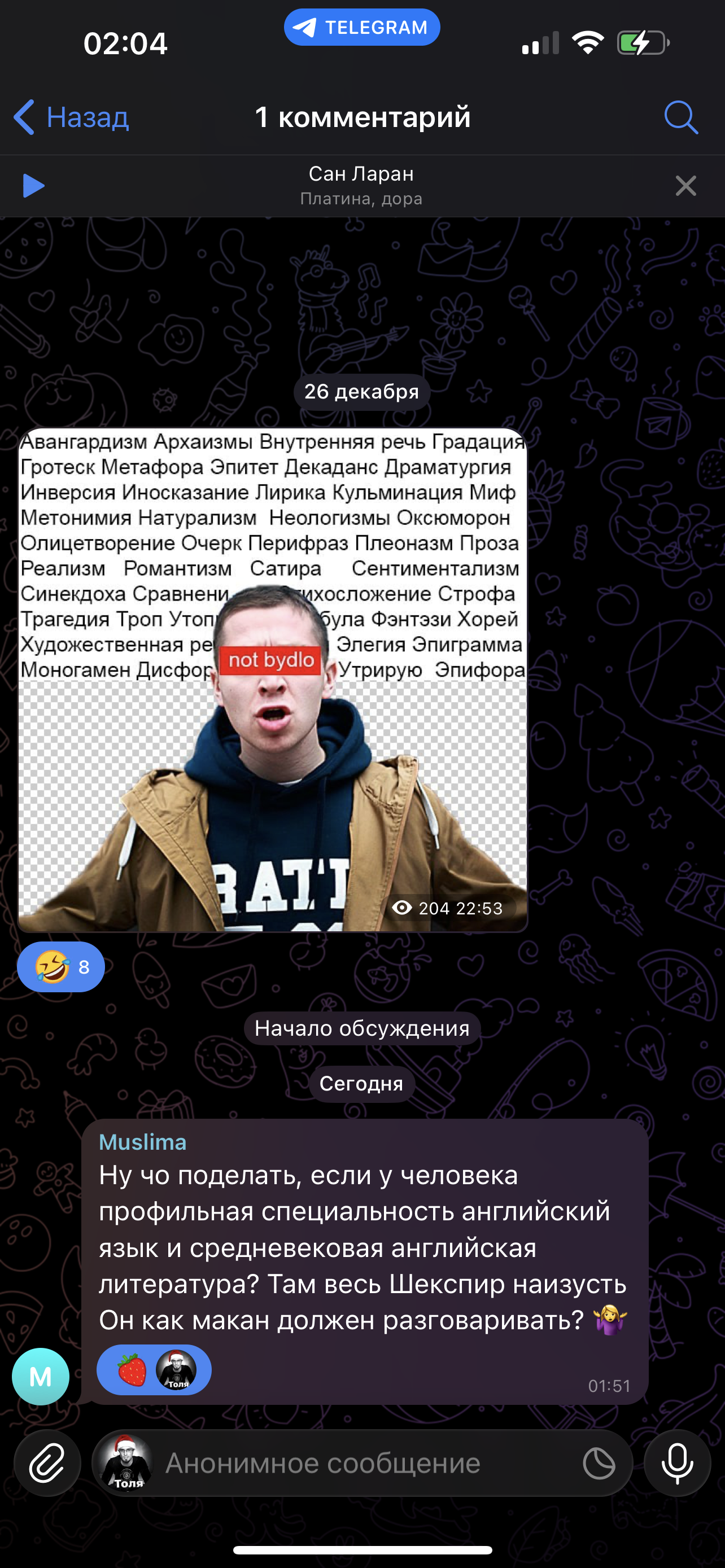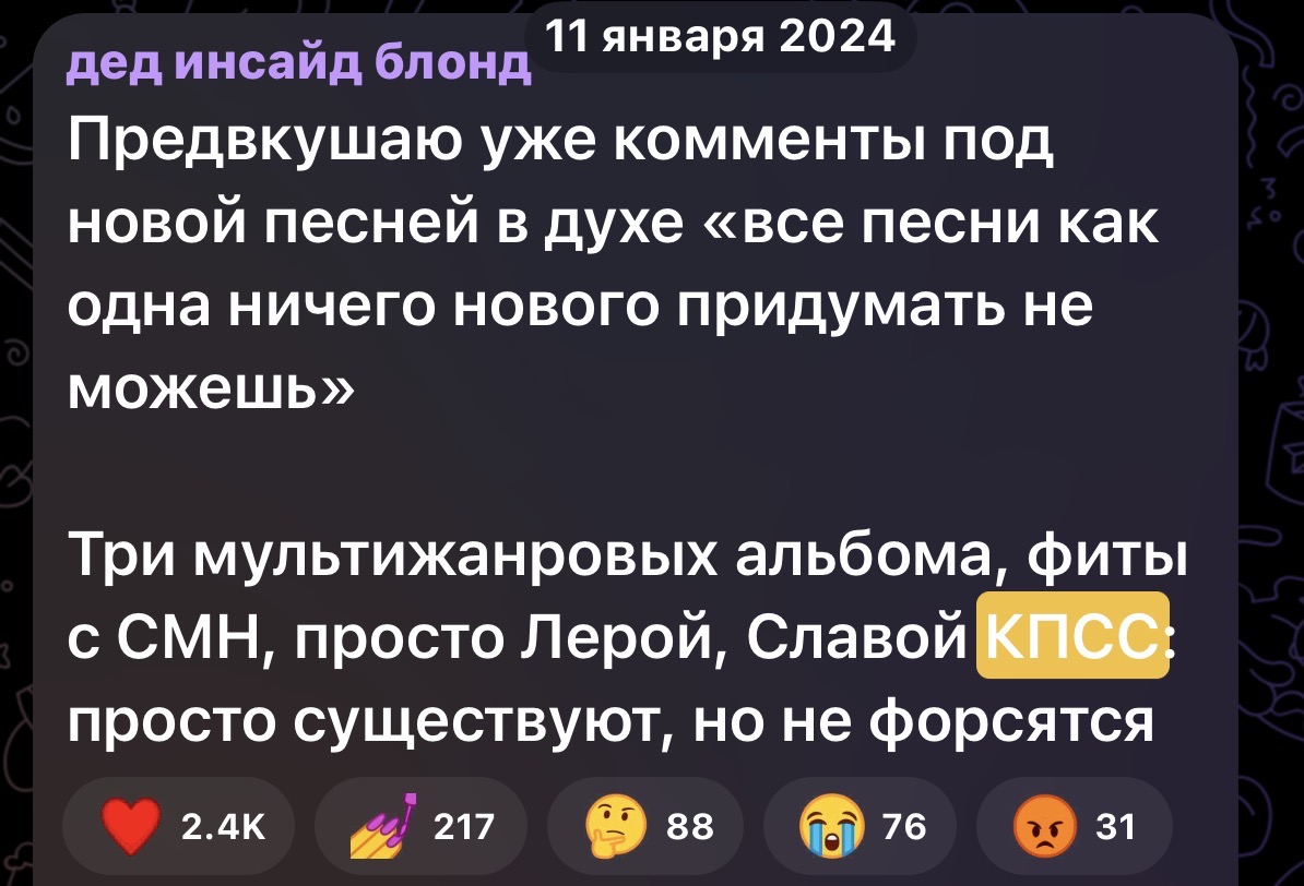 И еще к новостям мб пакет выложил подкаст у себя в тг где отметил некий форум где обсуждают слухи о нем. Будем продолжать копать грязное белье на репперков чтобы им было не скучно жить. Быть добру! Ну и еще он негативно высказался об интернете что тут слишком токсично и жопу ему не лижут, а вот на ирл квартирниках его хвалят и он заимел полезные знакомства. Зазвездился братик, отказывается от корней, как и славик жопич...