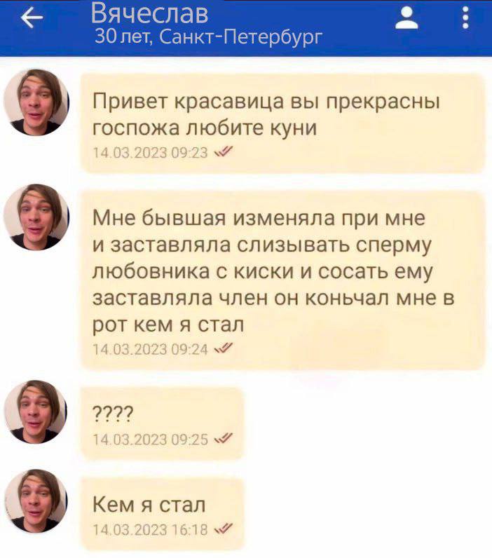 >>25979409 Насколько ему похуй было, интернеты прекрасно помнят в виде сальных переписок, совместного житья, поездок к родакам с мамой славы и тд Вот это да, поехавшая шлюха реально оказалось поехавшей шлюхой, вот это поворот блять!