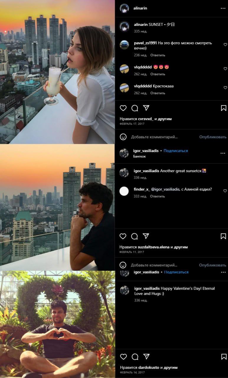 1. Дмитрий Оскес. Художник неформал. Начали встречаться когда она была в старших классов. Расстались когда она была 5-курсницей. 2. Игорь Василиадис. Был одним из топ манагеров ЮКОСа, потом стал типа крутым фотонрафом, фотал для гленцевых журналов типа ВОГа. Ебал Алинку 2011 - 2018 ориентировочно. 3. Гитман. Начали трахаться во второй половине 2018. Трахаются до сих пор. 4. Леонид Лыков. Мелкостример OSU. Ебались в 2021 - 22. Ебалась с ним паралельно Гиту.