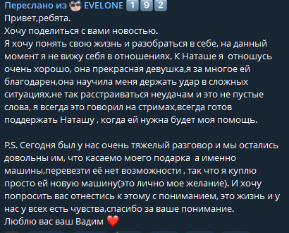 Вадиму очень тяжко,он загнал себя в ебанутую ловушку,чел получает эмоции только от стримов.Я почему-то пару месяцев назад думал,что возможно 26-ой он проведёт с продакшенами и тд,шоу и потом уйдёт на покой,но щас я понимаю он не сможет уйти на покой прям никак,ему будет скучно и он сойдёт с ума.А так в идеале ему провести 26-ой год на пике ещё раз,с туриком ня лям баксов,продакшенами нормальными и потом с Наташей в 27-ом году просто в кругосветку улететь