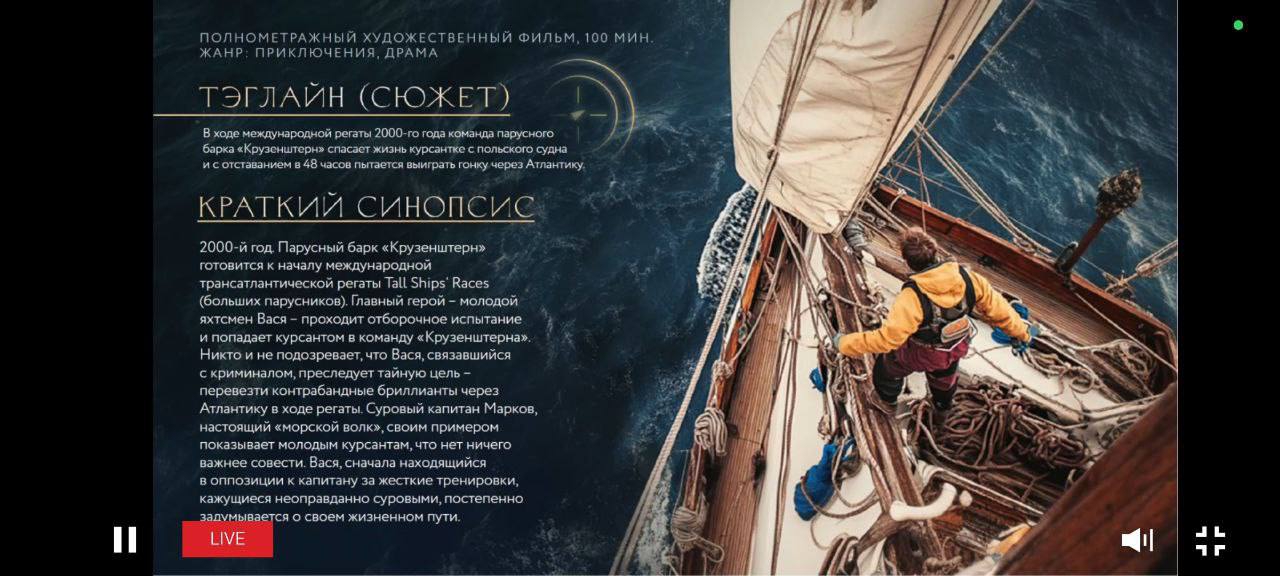 Худрук Евгений Миронов, продюсер Антон Мегердичев, режиссер Александр Богуславский. История про парусную регату, в ходе которой наши моряки пошли на выручку терпящим бедствие конкурентам. Сценаристы Яна Райская и Олег Погодин обострили реальную историю. Производство осуществляется киностудией ВЕРТИКАЛЬ.