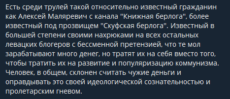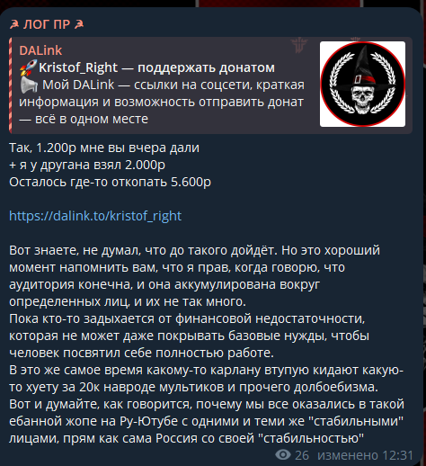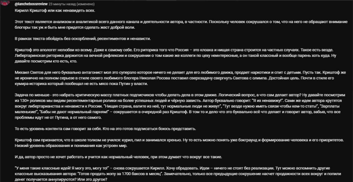 Сабж умудрился за рекордно короткое время прокатиться по всему подвалу рунета, одновременно обсуждая и красных, и правых, и в процессе случайно добился самовыпила собственных каналов на Ютубчике. Причина классическая — фута-контент, за что его в итоге аккуратно вынесли с ру-ютуба, но это не точно. Дальше всё по учебнику, как полагается каждой микро-селебе из околополитического болота, завёл личный шизо-чатик в телеге. Там он круглосуточно заливает поток сознания — от нытья про тян (с акцентом на вечную драму с бывшей Данилинга) до тяжёлой геополитической шизы про будущее России. В довесок приплетает андеграундные кружки уровня Светова, Юнемана и прочих Жожеков, чтобы выглядело солидно. Преподносит себя так, будто у него аудитория на пару сотен тысяч и его мнение весит хотя бы что-то (спойлер: нет). Но, внезапно, вызывает неподдельный интерес публики, будто у него есть какой-то тёмный лор и политическая тусовка Ютуба реально в курсе, кто он такой, просто молчит.