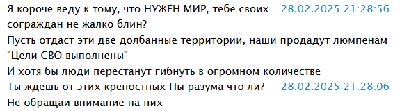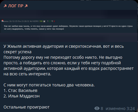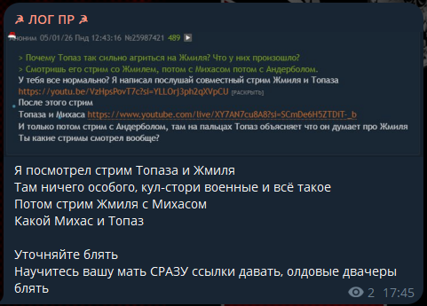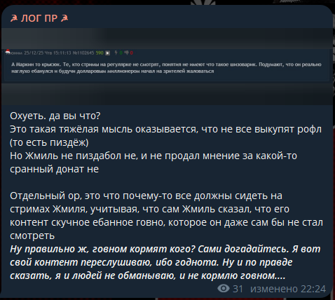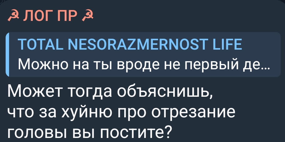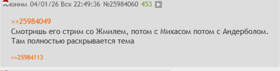 >>25983359 К чему лол? Вам даже Максин (ветеран СВО на минуточку) сказала на стриме, что я норм мужик. Так что автоматом идёте нахуй со своими угрозами. Я поболее вас готов впрягаться против всяких уродов. Вон, перечитайте мои сообщения касательно Маргинала.