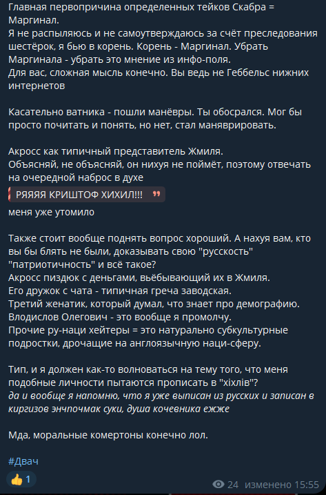 >Если Скабр желал смерти русским Зайди в хрю посмотри все вебмы Ты просил пруфы про пену, я тебе их дал. Спустя два месяца я вижу прогоны уровня: "он угрожал, да он кидал фотки, но он такой же как и я. Мой кумир. Борис не хотел зла." Зачем мне тебе давать пруфы, если ты все равно их не смотришь? >Касательно ватника - пошли манёвры. Ты обосрался Да, Криштофф я обосрался. Слово "хохлы" использовал президент Украины в предвыборной речи поэтому оно плохое, оно делает из вас зетников, "ватников" используют хохлы на своих антирусских митингах украинцы, поэтому оно не относится к анти-русской пропаганде. Ты смог хронологию составит, кстати? >Корень - Маргинал Может тогда ударишь? Пока ты последовательно бьешь только людей, собирающих на ВС РФ, а мальчик Толик для тебя мифологических враг которого должны быть другие. >А нахуя вам, кто вы бы блять не были, доказывать свою "русскость" "патриотичность" и всё такое? Гуманизм про Криштоффу это кричать как он любит людей, а в конце сознательно дегуманизировать их. >Прочие ру-наци хейтеры Давай говори правильно пиши, как говорил скабр: рунатские свиньи. Не останавливайся. Иди ко конца! Киргиз, ты пойми, тебе просто просят перестать через пост назвать своих сограждан: рассиянцами, пидорахами, зЕтниками, ватниками. Что ты с радостью делаешь для украинцев, но не хочешь делать для людей которых, с твоих, слов имеют одну кровь с тобой.