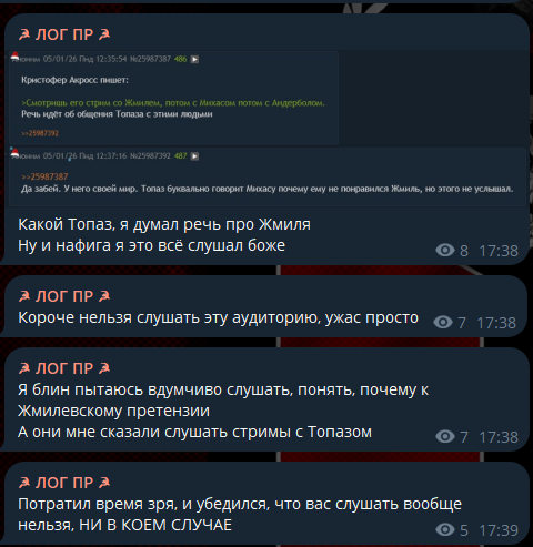 > Почему Топаз так сильно агриться на Жмиля? Что у них произошло? > Смотришь его стрим со Жмилем, потом с Михасом потом с Андерболом. У тебя все нормально? Я написал послушай совместный стрим Жмиля и Топаза https://youtu.be/VzHpsPovT7c?si=YLLOrj3ph2qXVpCU После этого стрим Топаза и Михаса https://www.youtube.com/live/XY7AN7cu8A8?si=SCmDe6H5ZTDiT-_b И только потом стрим с Андерболом, там на пальцах Топаз объясняет что он думает про Жмиля Ты какие стримы смотрел вообще?