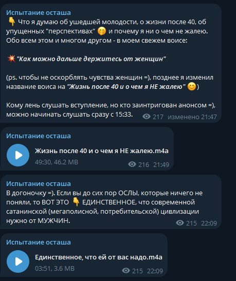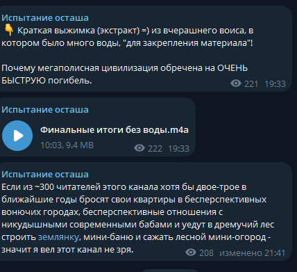 Сисенька как всегда уверен, что он впереди мегаполисных овощей, которые сейчас поголовно в алиментах, на антидепрессантах и алкоголе и подчиняются женам\рспхам. А он думает о пчеловодстве, землянке, жизни в лесу и мотоцикле.