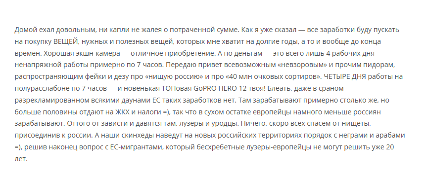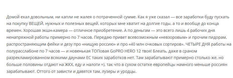 >Блеать, даже в сраном разрекламированном всякими даунами ЕС таких заработков нет. Там зарабатывают примерно столько же, но больше половины отдают на ЖКХ и налоги =), так что в сухом остатке европейцы намного меньше россиян зарабатывают. Оттого от зависти и давятся там, лузеры и уродцы. Ничего, скоро всех спасем от нищеты, присоединив к россии.