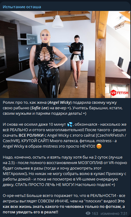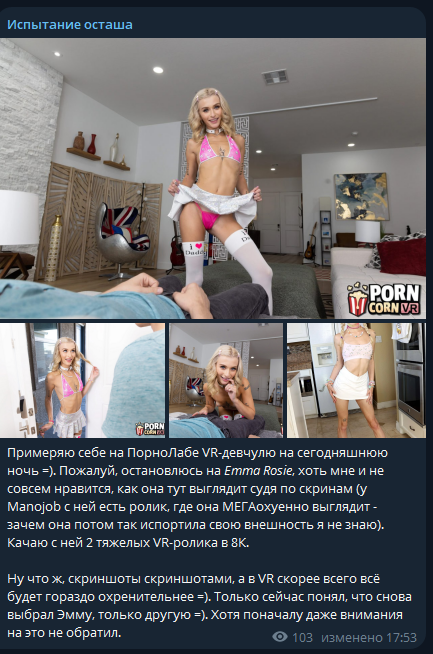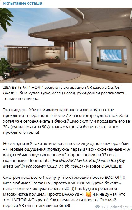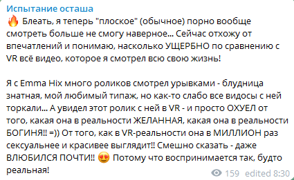 >>25777410 Ну хоть что то новое. Зато опробовал новые технологии в свойственной только ему манере. Правда опять выбрал актрису среднего пошиба. В своих вкусах кумер неизменен. Обожаю как Сися радуется по сути уже ставшей обыденностью развлекательному контенту. Этого VR-порева еще до пандемии было как гавна за баней. Чтоже, следим за нашим героем и его увлекательными приключениями. Я конечно за реальные походы к массажитскам и кринжовые подкаты к якуткам и прочим азиаткам, но хоть что то.