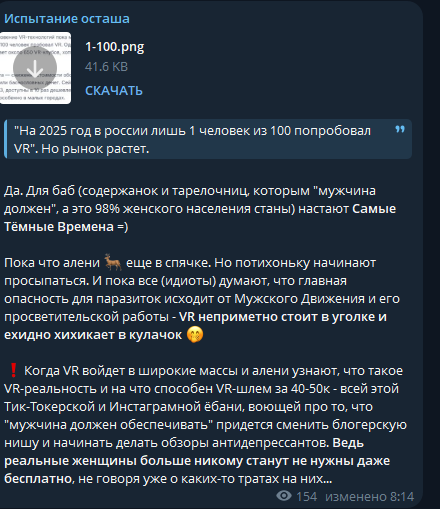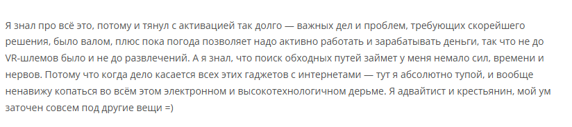 Мы теряем нашего Систерлигова, виртуальная реальность оказалась привлекательней обычной адвайты майи. Если и то и то нереально, какая разница? Зачем поднимать целину, разводить пчел и хикковать в землянке если можно надрачивать на всраток. Мозг не видит разницы. В землянке шлем работать не будет, как бы не остаться прозябать на городской овощебазе