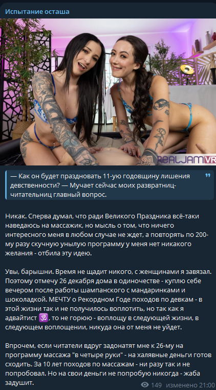 Именно тогда я активно читал Сисю и думал, что мб с массажки попробовать, т.к. секс что-то не идет. Но все-таки переборол себя и решил именно сексоваться со шлюхами, а не давать им дрочить свой писос. В следующий раз решил попробовать пойти на два часа. а не на час, благо цены тогда смешные были...(хнык). Но об этом следующем выпуске.