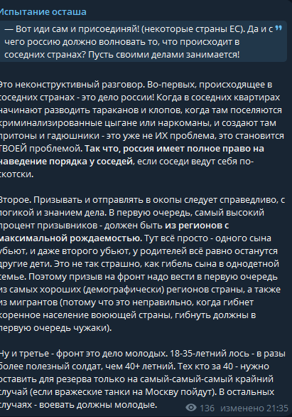 Сиська - это напрочь лживое существо. Он будет последним-распоследним кто выпилится, так как трясется за свою шкурку как никто другой. Это он только на словах такой якобы безбашенный. Рассказывал как он под абрамсы будет бросаться. Потом рассказывал как в вагнер запишется. Потом рассказывал как в иностранный легион запишется... Бросился? Записался? Вот то-то и оно. Продлжает есть мамкины пирожки и дальше курлыкать)))