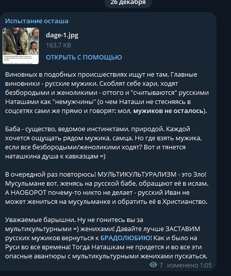 У Сиси всегда такая логика. Ему не дают норм бабы? Все бабы не нужны, пусть под мигрантов ложаться.