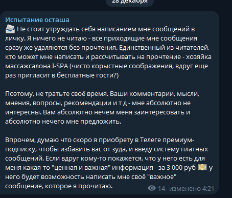 >>25763219 Анон ну как бы УЖЕ В блоге он писал, где то два-три года назад что благодаря его блогу многие салоны нарастили себе поток клиентуры и что по идее это и его деньги тоже. Так что или пожизненные бесплатные гости или платите процент от прибыли. Лень искать но точно писал подобный пост.