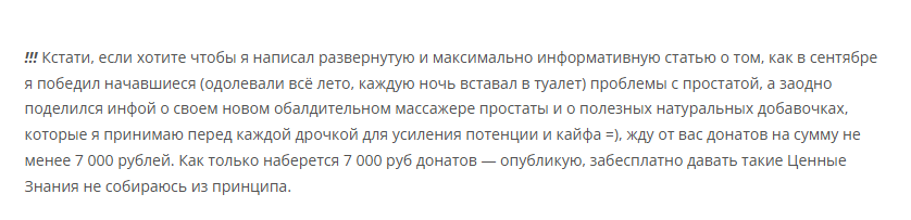 В этом буквально единственный смысл сисиного существования на этой грешной земле и его говноблога. Так и сформировался костяк сисиной аудитории. Я неоднократно упоминал в прошлых тредах эпизод когда некий донатер написал сисе в личку с деловым предложением: сися выдает по одной статье в неделю о своем лоховском существовании, а донатер стабильно выплачивает ему гонорары, читает сисины сочинения и кайфует от того, насколько он охуенно живёт по сравнению с сисей. А сиська разумеется отказался - еж птица гордая!