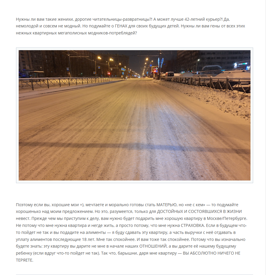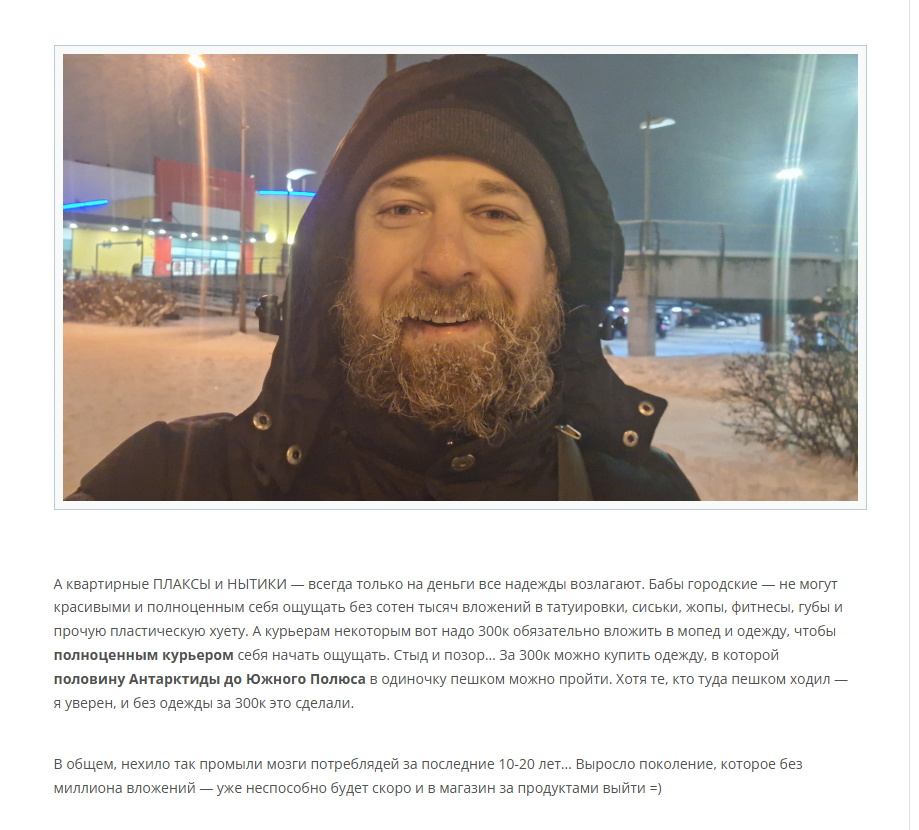 >А квартирные ПЛАКСЫ и НЫТИКИ — всегда только на деньги все надежды возлагают. Бабы городские — не могут красивыми и полноценным себя ощущать без сотен тысяч вложений в татуировки, сиськи, жопы, фитнесы, губы и прочую пластическую хуету. А курьерам некоторым вот надо 300к обязательно вложить в мопед и одежду, чтобы полноценным курьером себя начать ощущать. Стыд и позор… За 300к можно купить одежду, в которой половину Антарктиды до Южного Полюса в одиночку пешком можно пройти. Хотя те, кто туда пешком ходил — я уверен, и без одежды за 300к это сделали.