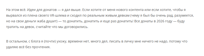 >>25908405 Миха, ты не прислушался даже к мнению за 300К местного донатера-мочеглота, какие сообщения за 3 000 р??? Донат, бесплатные гости - забудь об этом. Идиотов(кроме любителя урины) среди твоих читателей нет. Да и девочкам нахер ты сдался без денег, непонятно на что ты надеешься. У тебя VR-игрушка есть, вот с ней и развлекайся.