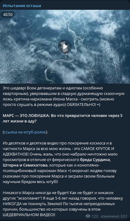 >>25995243 Посмотрел шизовидео озвученные нейросетью которые выложил лысый в последнее время, в первом же видосе соотносится эффект джанибекова со сменой полюсов земли. И как обычно эта хуйня опровергается через минуту гугления. Во втором видосе про Марс в конце совсем все плохо - утверждается что у детей колонизаторов в первом же поколении будут большие глаза и более длинные и хрупкие кости из-за пониженной гравитации. Сися просто идеальный npc для того чтобы срать чем угодно ему в башку, главное подать инфу как откровение с вау эффектом