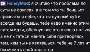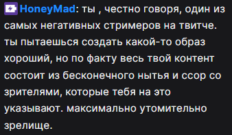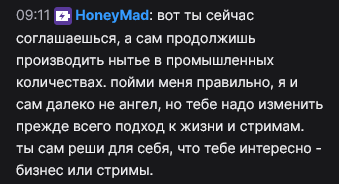 Мэд такое мощное медиа влияние аккумулировал, что несколькими постами может разъебывать целые группировки стримеров. Те же сиськастый Бустер, накрутчик и скамер Братишкин и вся пиздобратия Дианочкина не могут оправиться после того, как Мэд катком по ним прошёлся. И сейчас он зашёл к Бьёрну, оставил несколько постов в чате, а тот сидел обоссанный и оправдывался перед Мэдом за то что он душный хуй и толстый.