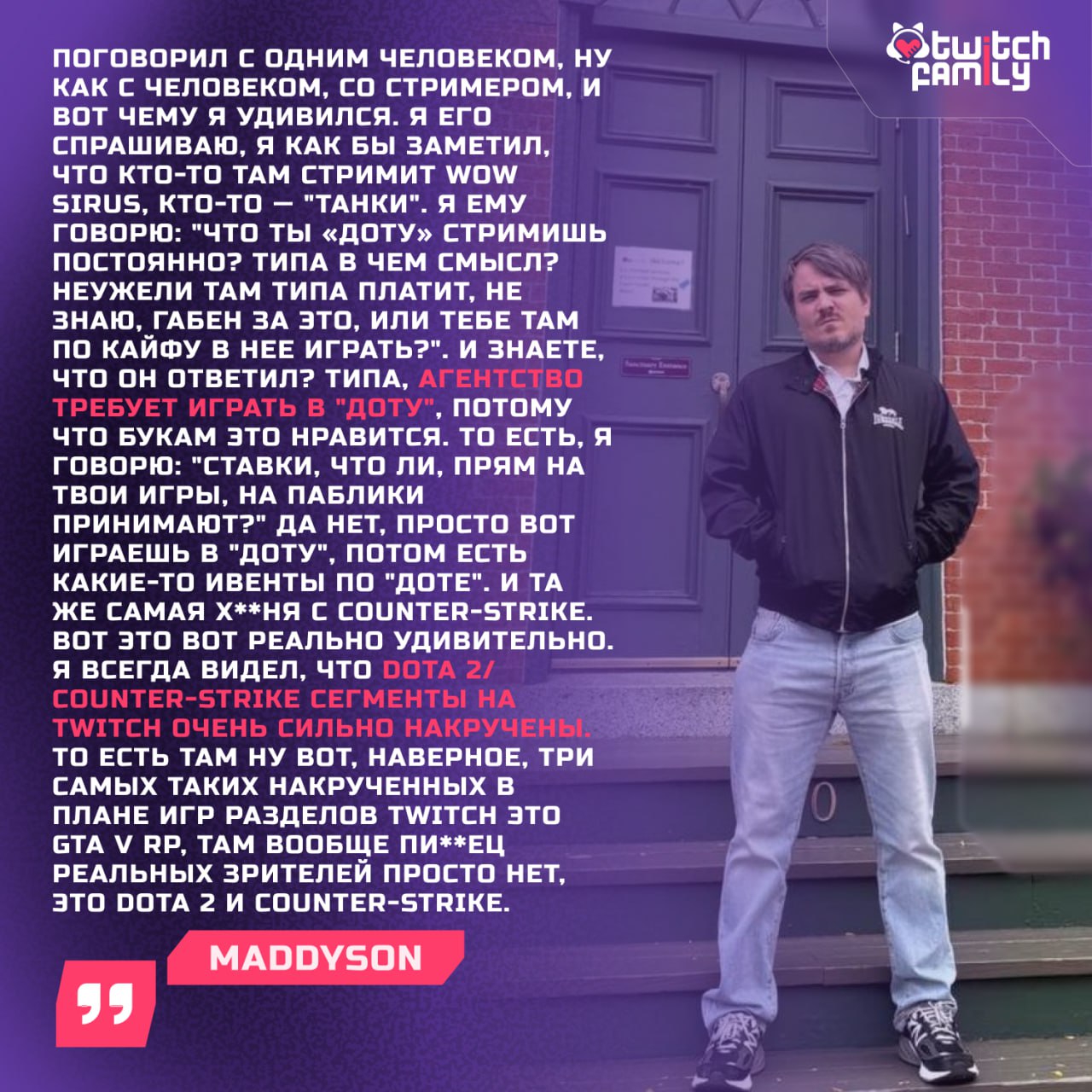 смотрел у факера записи стримхаты и какой же жопич там неприятный. постоянно ноет, до всех доебывается, че то всё умничает, какую-то тупость несёт с видом эксперта. а всё окружающие прям видно сидят и ТЕРПЯТ. искуственно посмеиваются. король же типа хуев. неудивительно что в итоге с половиной коллег потом разосрался, такого друга и врагу не пожелаешь.