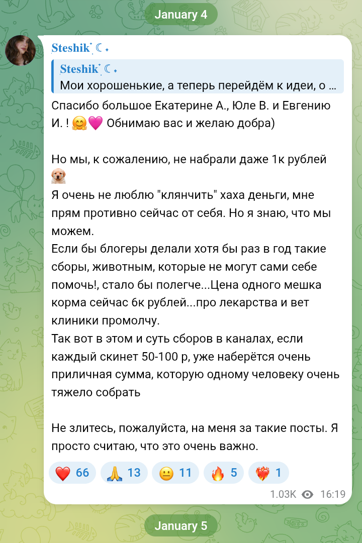 >>25995412 Подтверждение того, что у любого нормального приюта — чистая бухгалтерия и отчётность за полученные пожертвования. Если ты имбецил и не способен отличить приют от скама, то проблема в тебе.