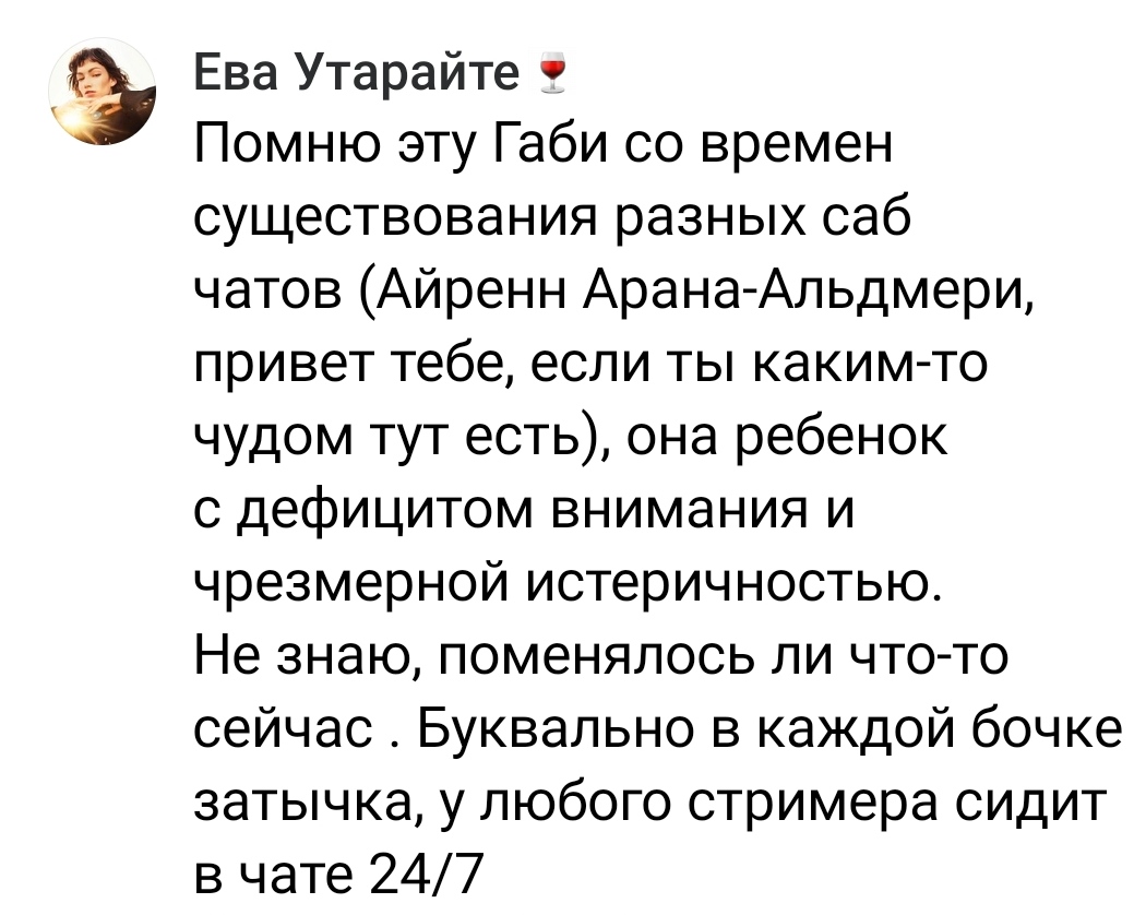 >>26008917 Габи - наша стримерша, воспитана тредом и черкашом. Стримила с девства, потом все реже и сейчас вообще прекратила. Тебе какие ссылки нужны? Телега, вк, твич? Она не ответит, сейчас хорошо знает себе цену. Обычная девка, симпатичная, не без этого. На твичах таких вагон. Нам то нравилась потому, что в наших двачерских темах шарила, с тредом активно общалась. Про теневого слухи и сплетни, никто тут точно не знает.