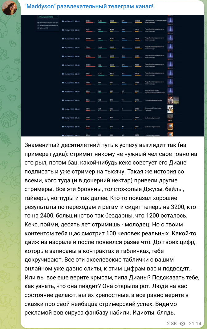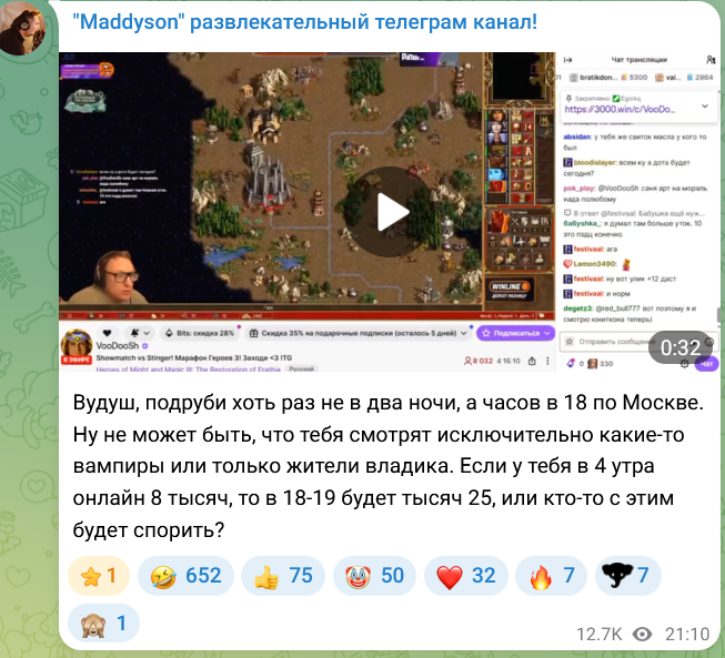 Мэддисон обвинил Вудуша в накрутке из-за 8 тысяч зрителей: «Не в 4 утра будет 25 тысяч» Илья «Maddyson» Давыдов обратил внимание на онлайн Александра «VooDooSh» Шальчинова. «Вудуш, подруби хоть раз не в два ночи, а часов в 18 по Москве. Ну не может быть, что тебя смотрят исключительно какие-то вампиры или только жители Владика. Если у тебя в 4 утра онлайн 8 тысяч, то в 18-19 будет тысяч 25. Или кто-то с этим будет спорить?» – отметил стример. Александр «Voodoosh» Шальчинов в сентябре вызвал Илью «Maddyson» Давыдова на бой из-за обвинений в накрутке зрителей на Twitch. Стример отказался от предложения, назвав его «тупым миньоном». В декабре Давыдов извинился за свои слова.