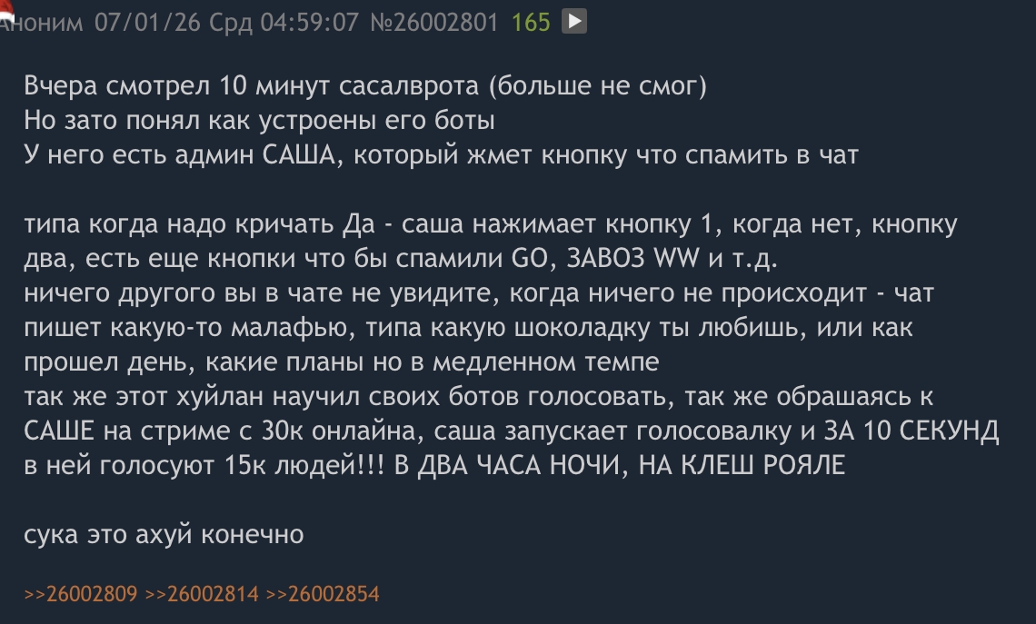 Очередное обострение началось на фоне ботов и сасайБота. Гайс, как же это заебало... Да и кто такой этот сасайБот?