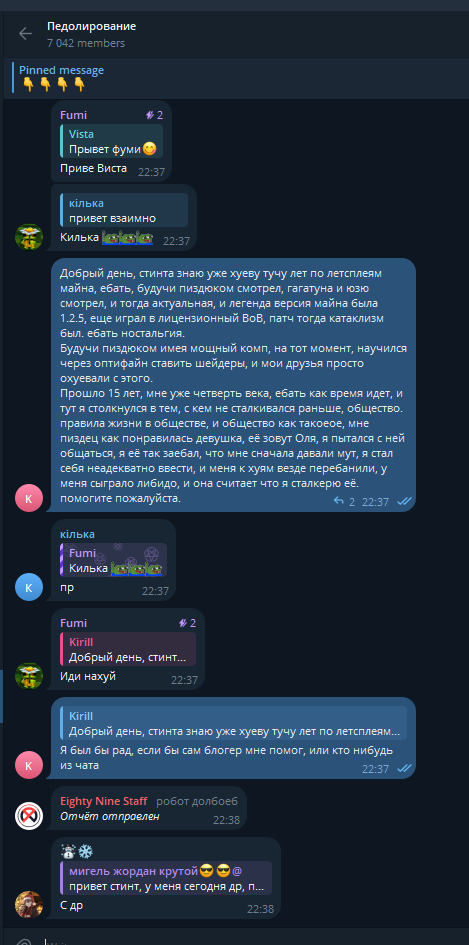 >>26010229 upd: не отрицаю, что у него самая лучшая стата тг, но с таким же успехом можно взять тг любого из еблан сквада, тг активный, на стримах 3к, это вообще не показатель чего-либо