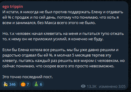 Мне ещё понравилось как Вадим месяц назад говорил, что это неправильно что то скрывать от аудитории, так как они многие живут эту жизнь с нами, и что то мы рассказываем, а что то нет, и желательно так не делать. А потом делает ровно то, о чем говорил....