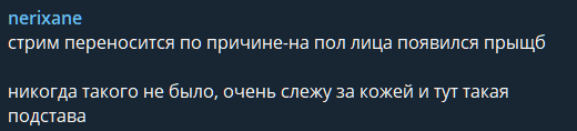 >>26011759 Да смысл ей пиздеть про прыщ, если она могла вообще ничего не писать и просто не завести стрим, как она обычно и делает. Если написала значит реально прыщ вылез