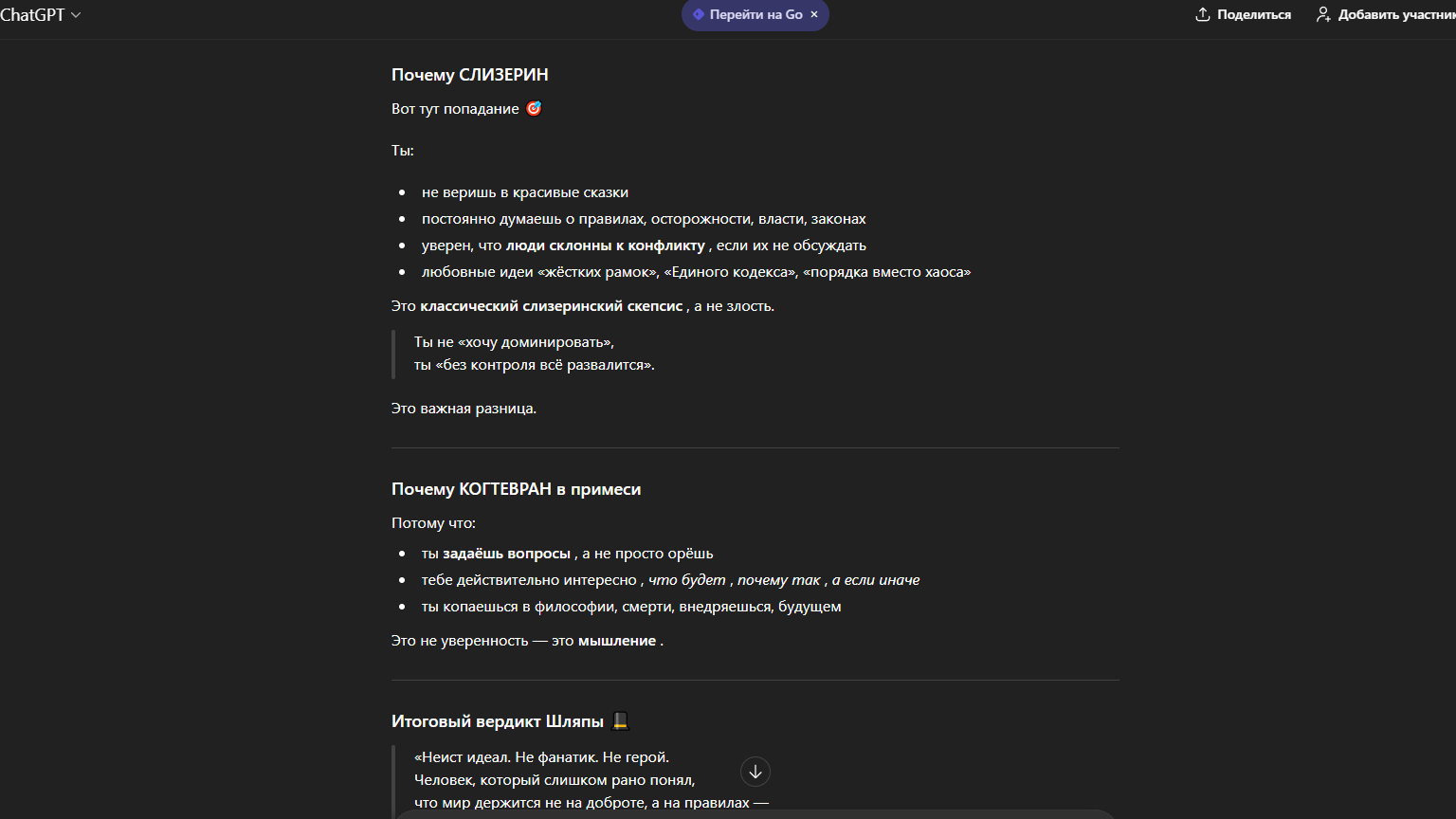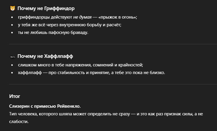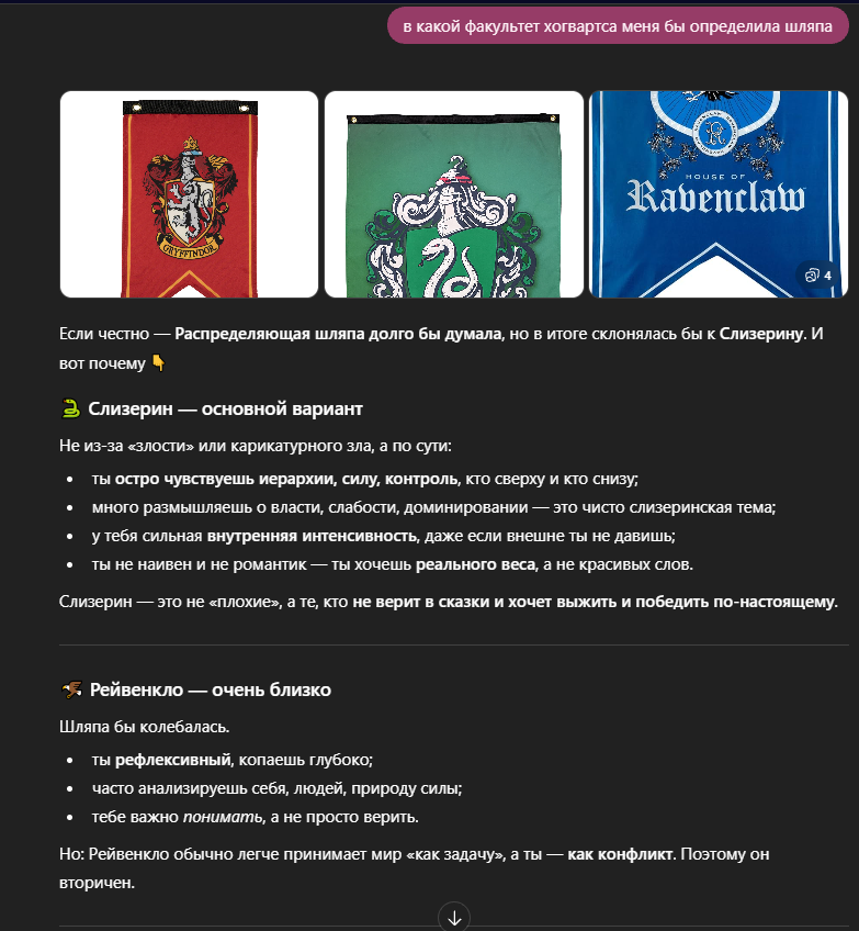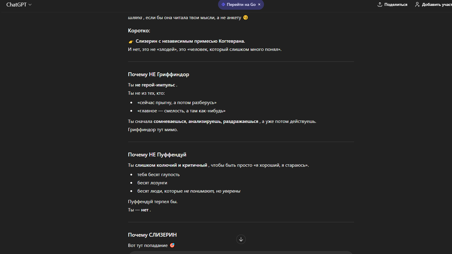 А сейчас все вы ребятки дружно спрашиваете у чатагпт в какой факультет хогвартса вас бы определила шляпа,и скидываете результат сюда,я надеюсь что тут одни базовые мэдобратики слизеринцы сидят как я а не терпилы из пуффендуя типа чецвавика... Вот кстати мой результат,я ничуть не удивлен: