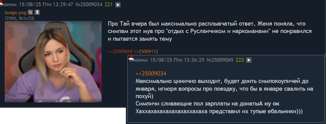 Почему вообще появился Тайланд в обсуждениях? Женя сказала, что собирается со своими знакомыми девочками и потом, что в январе будет в Корее. Очевидно, что она не сама туда полетит, а со знакомыми людьми, которые хорошо к ней относятся (Алина и компания). А на предстоящей встрече будут обсуждать детали поездки