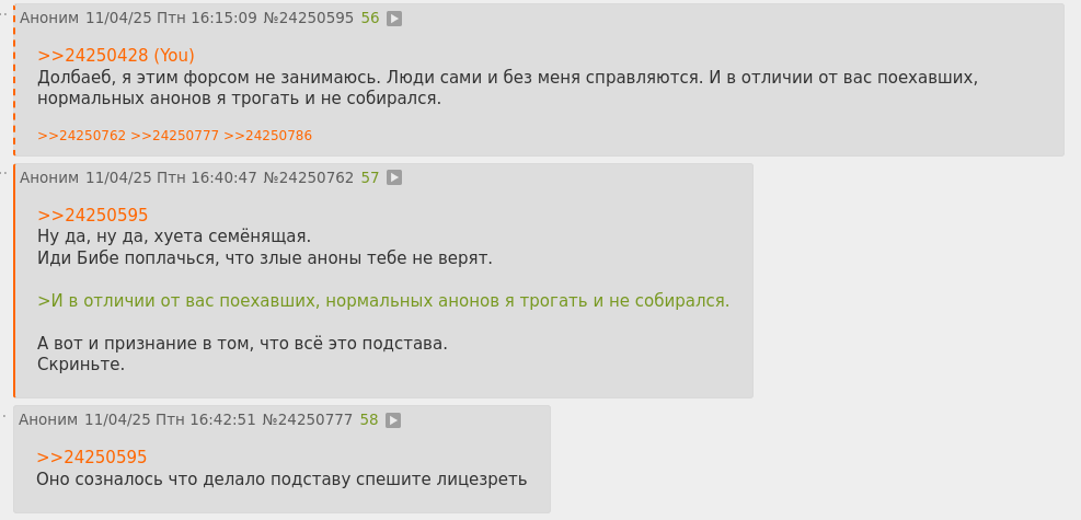 >>25937044 > НА ДВАЧЕ В НАБЕГОТРЕДЕ ПОЯВЛЯЕТСЯ ПОСТ ОТ ГРУ - "НАРОД, ЭТО ЧАСОМ НЕ ТОТ ШИЗИК, ЧТО ЗАЯВЫ КИДАЛ? Я РЕШИЛ СОБЛЮСТИ ТРАДИЦИИ И ОКРОПИЛ ЕГО МОЧОЙ ПОСЛЕ ТОГО, КАК ПРИШИБ" Чет, проиграл.