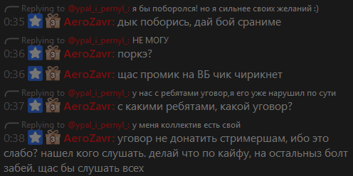 Вот поэтому нам ничего не известно, ибо любого обсуждающего кроме пуки-каки или цены на машины-квартиры на подконтрольных ресурсах сразу же повергнут обструкции. Ни Корею обговорить, ни прочие планы, ни как прошли праздники в Магнитогорске, ни ноябрьские операции, сами не спросят и вам не дадут, если пробьётесь через анальную модерацию. Атмосфера вокруг стримера абсолютно скотская, хуже только у Юзи, но это безусловно впереди ещё