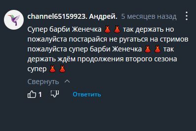 >>26046210 Этот прав. Даже если попробует вернуться к видео на ютуб, то очень быстро поймет какой это геморрой и вернется к стримам, хоть на кик, хоть на вк. Там же нельзя выложить ролик как она фильм какой-нибудь смотрит )) Там придется контент делать, а это сложно, а значит не для Женечки. Скорее будет стримить на 300 инвалидов, но донатик все равно лутать исправно, поскольку концентрация помешанных слишком велика >>26046602 Обещанного три года ждут, а Женечка всего за год управилась >>26046657 Не знаю, всем наверно >>26046968 В том числе, но вряд ли это удастся из-за лени, см. 1 ответ. Эти полоумные симпы уже доебали малютку, один только дурдомовец двачерский чего стоит, а у нее там целая приватка таких шизов пидорнутых, просто представьте >>26047173 Если нет стримов и доход от чего-то другого, особенно из-за границы, то уже похуй