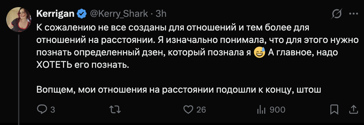 >>26040585 Заметьте рассталась не спокойно, даже в посте подколола его, дескать, он не смог познать внутренний дзен отношений на расстоянии, а вот Я-ТО ПОЗНАЛА.