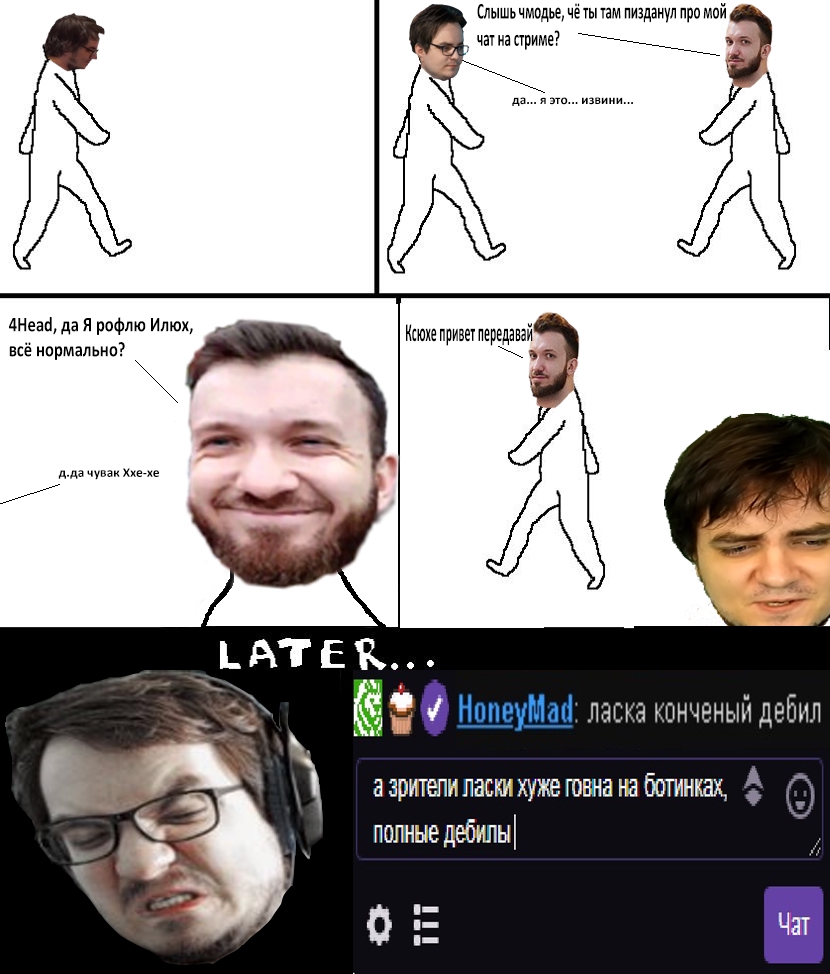 >>26057814 между этими пидарасами на твоем пикрил буквально "война", они дебатируют (заочно, но похуй), смотрят клипы, спорят, комментируют ничего нормального не происходит в плане споров, типичный РУ твич а у нас то что ты назвал - это просто позорище, пару голосовух в телеге втихую от жопича, и жидкий пук от какаш каврота "ну там этот интернет персона как его" на 10 секунд и все т.к ему не выпустили методичку и не хочется рушить фейковый образ "нашего парня из мчс" д