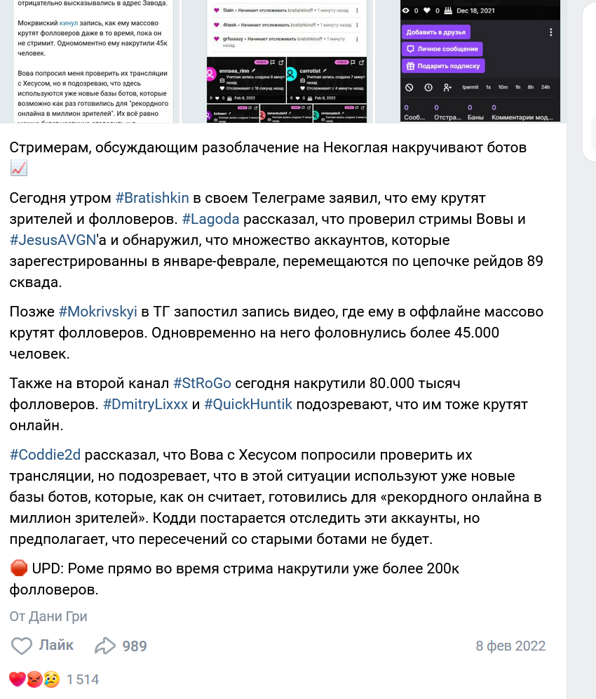 чел ботов на твиче все обсудили когда некоглай первый раз крутанул 150к, тогда все обсосали и то как ботофермы работают и рофлы про трафик с тиктока. и ютюберы про это говорили я только не помню в каком году это было